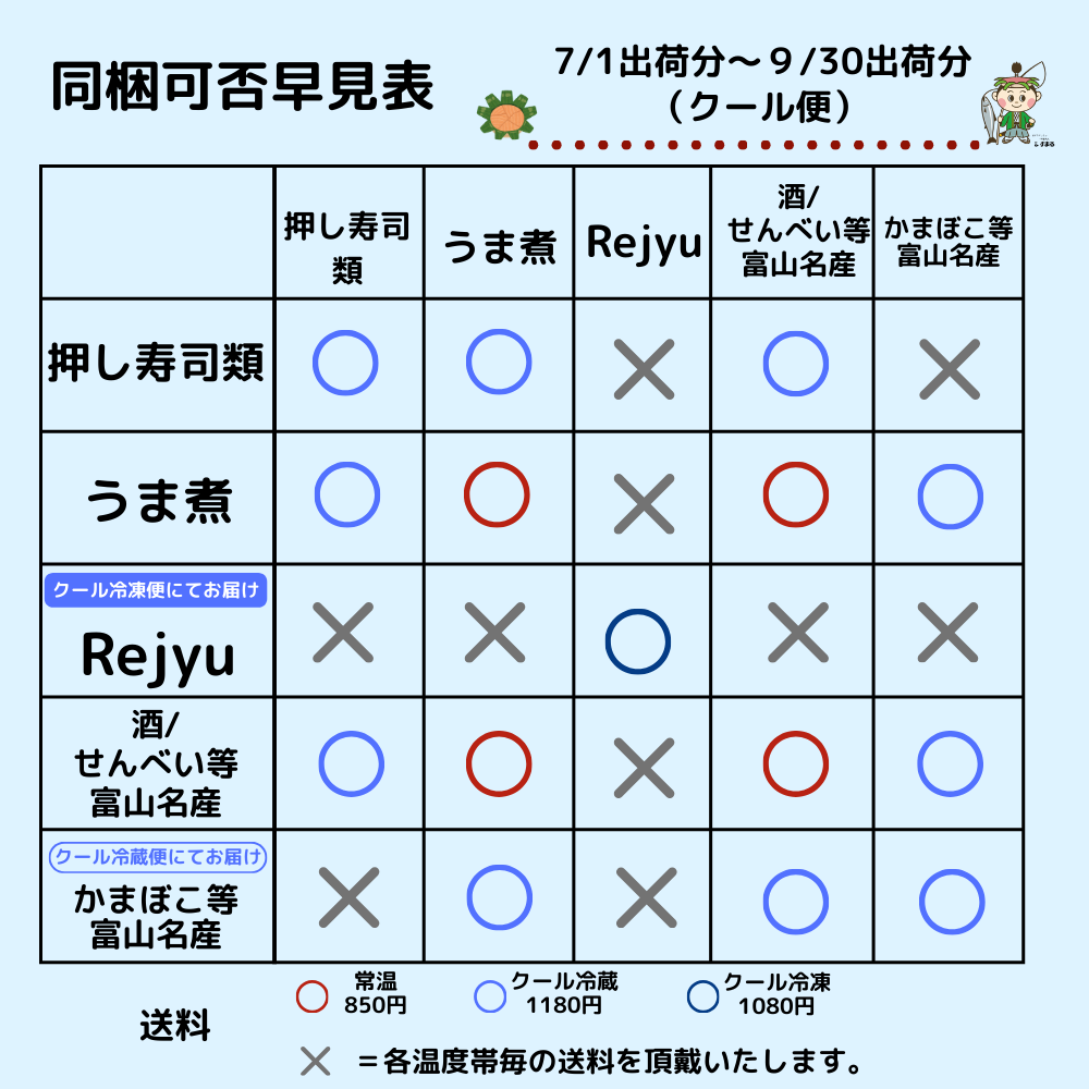 「押し寿司類」をお買い求めの場合、夏季(7月・8月・9月)は「クール冷蔵便」にてお届け可能です。