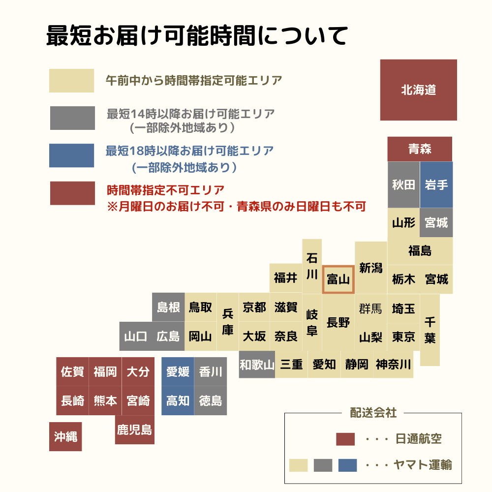 北海道・青森県・九州地方・沖縄県へのお届けは、「お届け時間帯不可」となります。