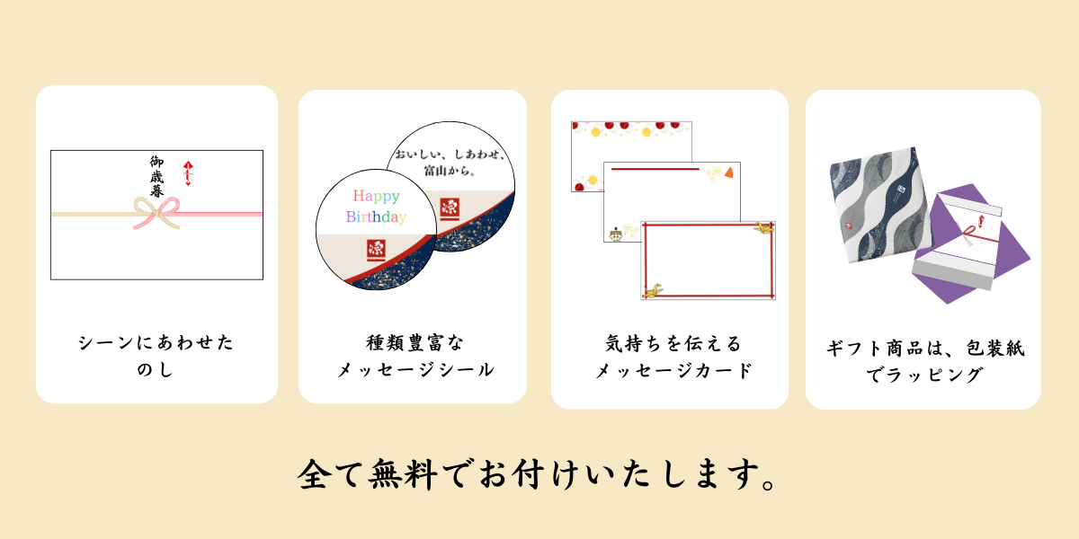ご注文される商品ページにて、のし・メッセージシール・メッセージカードをご選択ください。 ※一部対象外の商品がございます。詳細は各商品ページをご確認ください。