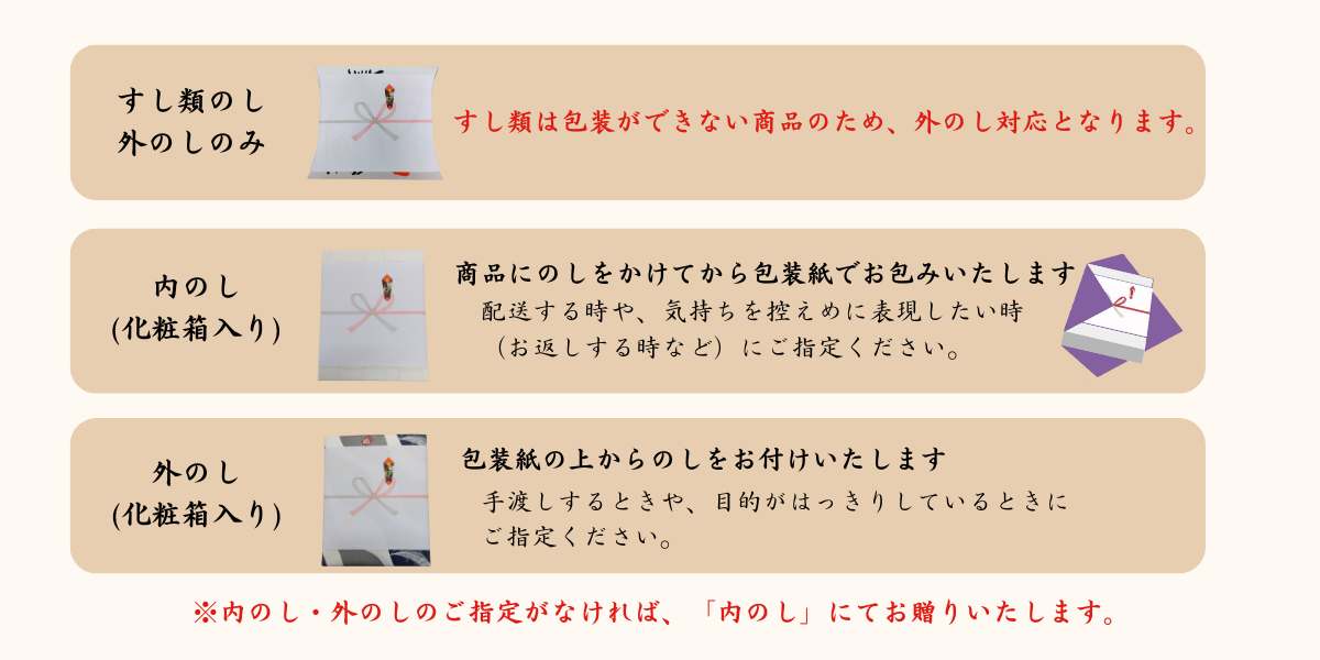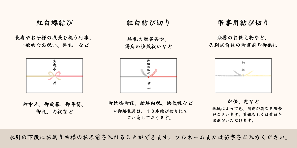 シーンに合わせたのし紙をお選びください。水引は以下となります。一部商品はのしがお付けできません。詳しくは各商品ページにてご確認ください。
